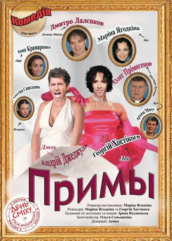 Кто же не слышал о комедии «В джазе только девушки»? Феерическая комедия «Примы», по мотивам пьесы «Примадонны» известного американского драматурга Кена Людвига напоминает именно этот фильм своими сногсшибательными перипетиями, переодеваниями и авантюрной атмосферой. Насколько это легкое дело для мужчины притворяться женщиной? И достаточно ли только научиться ходить на каблуках и надеть женское платье? Именно это придется проверить на себе Георгию Хостикоеву (известному актеру театра и кино) и Андрею Джеджуле (популярному теле, радио ведущему и актеру). Их персонажи – актеры Лео и Джек, после неудачного выступления случайно узнают, что миллионерша преклонных лет разыскивает своих племянниц, которые потерялись в детстве, чтобы отдать им свои миллионы. Миллионы, ради которых можно рискнуть и сыграть комедию с переодеванием в женские платья! Тем не менее миллионы так просто не получишь! Проблемы подстерегают героев нашей комедии каждую минуту: во-первых, у бабки уже есть одна наследница Мэг (Марина Ягодкина), во-вторых, делить наследство совсем не собирается влюбленный не столько в Мэг, сколько в ее наследство пастор Дункан (Олег Примогенов), в - третьих, бабуля (Кристина Синельник) оказывается очень живучей, а авантюрист доктор Майерс (Дмитрий Лаленков) и его сын – начинающий-качок Буч (Артем Мяус) также имеют свои планы на наследство миллионерши. А наивная и прямолинейная Одри (Инна Крамаренко) невольно становится соучастницей «мошенниц». Ну и конечно, все планы героев меняет любовь.