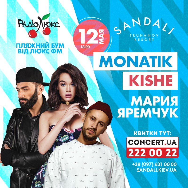 Не пропусти пляжный бум от Люкс ФМ на абсолютно новой и эксклюзивной локации “SANDALI”, на Трухановом Острове! Мария Яремчук, Kishe и Monatik зажгут для тебя в этот вечер и заставят запомнить его на всю жизнь! Максимально отдохни от городских шумов и суеты, при этом, не покидая столицу! Все прелести загородного отдыха – в городе!