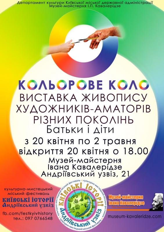 На киевском Монмартре - Андреевском спуске - в музее-мастерской им. И.П.Кавалеридзе 20 апреля в18.00 часов откроется необычная выставка художников-любителей "Кольорове Коло". Это событие - мероприятие культурно-художественного проекта "Киевские истории. Андреевский спуск". На открытие выставки приглашены известные художники и искусствоведы.