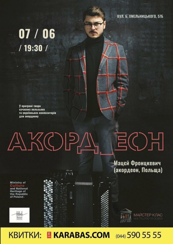 Fundacja Muzyczne Aspiracje (muzyczneaspiracje.pl) представляє 7 червня о 19:30 в Домі МК музичний проект: “Мацей Фронцкевич (Польша). Акордеон”