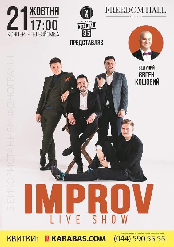 «Cтудия Квартал 95» представляет новый юмористический проект «Improv Live Show». Все, что будет происходить на сцене — полная импровизация. Никаких заготовок и сценария, все темы для шуток дают зрители. Никто не знает, что произойдет в следующую секунду, но точно известно, что это будет очень смешно!