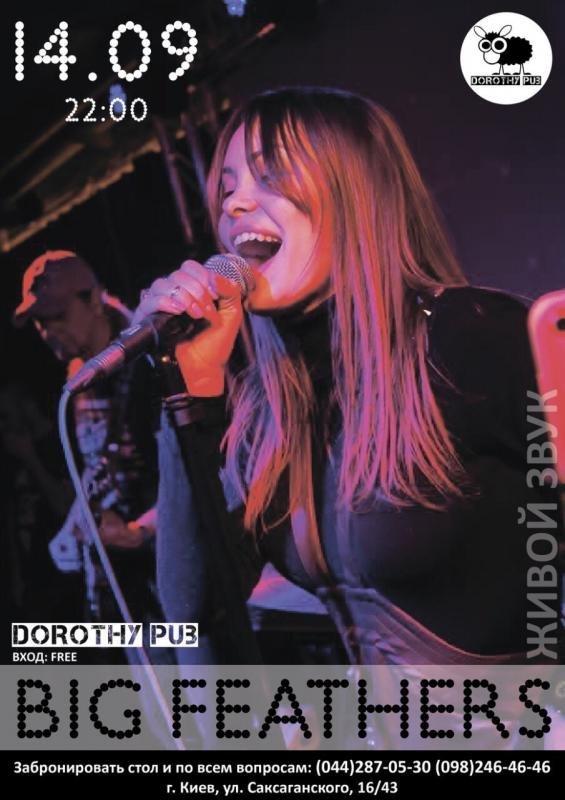 Big Feathers - киевская кавер-группа, играющая в стилях blues-rock, funk, punk-rock pop-rock. Музыканты группы работают вместе с 2009 года, за этот период было сыграно огромное количество концертов в рамках самых разных мероприятий в Киеве, Харькове, Oдессе, Черкассах, Белой Церкви и других городах нашей страны.
