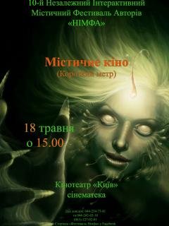 Фестиваль «Нимфа» является уникальным явлением, потому что настоящая мистика в искусстве - это не просто творческий прием, а средство воздействия на духовный мир зрителя. В художественной среде есть много талантливых творцов, которые вдохновенно работают в этом направлении. Десятый год подряд Международный фестиваль авторов "НИМФА" предоставляет им возможность продемонстрировать широкой общественности свои работы. Отдельная страница фестиваля представляет работы молодых кинематографистов. С каждым годом увеличивается диапазон киностранички: к короткометражным лентам присоединяются полнометражные фильмы, а в этом году конкурсная программа включает также и мультипликационный фильм. Это свидетельствует о том, что фестиваль расширяет свои рамки и набирает популярность. В программе киностранички Х-го международного фестиваля «НИМФА» представлены следующие работы: Гордей Наталья «Клетка», Гриб Павел «Майя», Новицкая Светлана «Тоннель», Пудич Сергей «Hunter for Metal», Данчук Устин «Равновесие, Грачев Александр (анимация) «Другой».