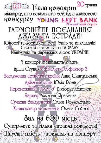 Грандиозный эстрадно-джазовый гала-концерт! Известные джазовые и эстрадные певцы споют на одной сцене с будущими звездочками - победителями международного вокального конкурса «Young Left Bank»!