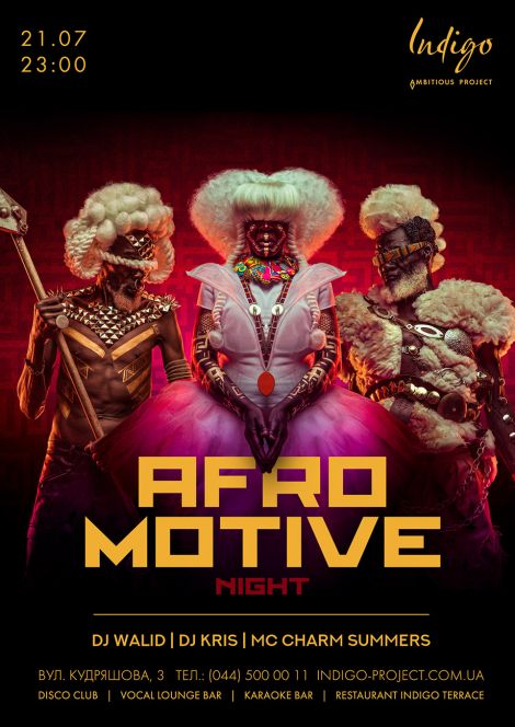 Когда вы попадете на эту вечеринку, мы рекомендуем вам заказать самый огромный и экзотический коктейль, закрыть в глаза и почувствовать вокруг себя атмосферу африканской ночи. Почувствуйте теплый южный воздух на своем лице, услышьте бой барабанов и необычное пение на незнакомом языке. Отдайтесь этому гремучему коктейлю сенсорных ощущений ритмов и вкусов на вечеринке Afromotive Night в Indigo.
