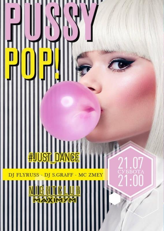 PUSSY POP! #JUST_DANCE.Ураганный концентрат самой отборной клубной музыки в одном большом танцевальном флаконе! Коктейль драйва и звука! Только для тебя и только в Максимуме! Всю ночь развлекаютDJ FLYRUSSиDJ SERGEY GRAF,а так жеМС ZMEY