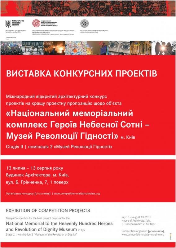 13 июля 2018 в 10:00 в киевском Доме архитектора начнет действовать выставка всех участников II стадии Международного открытого архитектурного конкурса проектов по объекту "Национальный мемориальный комплекс Героев Небесной Сотни - Музей Революции Достоинства». Вторая стадия конкурса касалась проекта самого музея - уже с учетом вида мемориальной части. В финале соревновались шесть проектов. Их авторы на условиях анонимности активно сотрудничали с организаторами конкурса, в частности посещали Киев, осматривали места событий, общались с родственниками погибших.