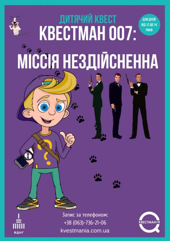 А был ли Ваш ребенок на квесте «Квестман 007: миссия невыполнима» от компании Квестмания? В аш ребенок готов прожить целый час в мире тайн, загадок и опасностей? Только на этих выходных у Вашего ребенка будет такая возможность! Супер секретная миссия, карты GPS , приследование преступников, в злам ывание супер сложных замков и сканирование тайных посланий с помощью QR - кодов. Ваш ребенок в течении часа сможет, овладеет всем сектором навыков Супер Агентов планеты Квестманя.