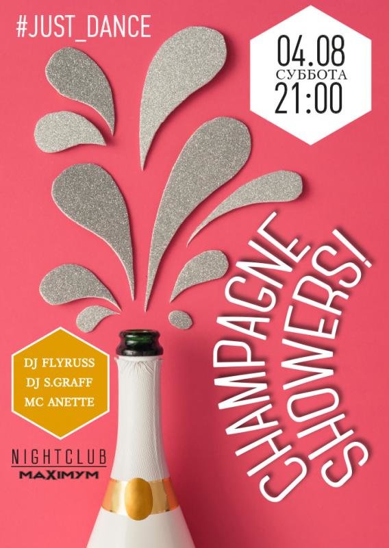 CHAMPAGNE SHOWERS! #JUST_DANCE.Ураганный концентрат самой отборной клубной музыки в одном большом танцевальном флаконе! Коктейль драйва и звука! Только для тебя и только в Максимуме! Всю ночь развлекаютDJ FLYRUSSиDJ SERGEY GRAF,а так жеМС ANETTE