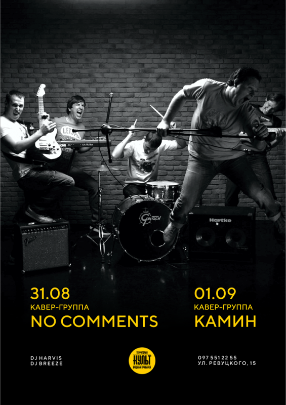 31 августа: No Comments и DJ Harvis, 1 сентября: Камин и DJ Breeze