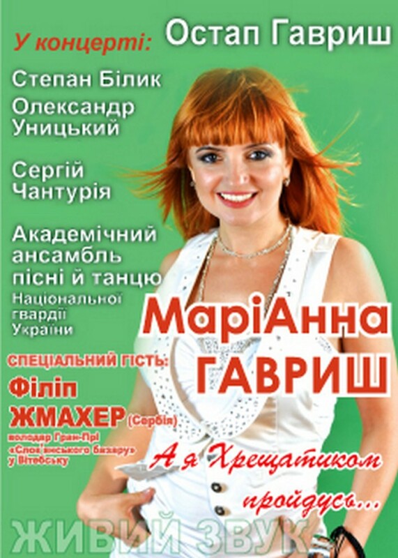 Українська співачка МаріАнна ГАВРИШ представить київській публіці свою сольну програму «А я Хрещатиком пройдусь». Концерт співачки – це справжня творча історія, яка поєднає в собі різножанрову музику: від традиційної пісні, патріотичної тематики, до популярного денсу та року. У кожній пісні її тембрально милозвучний голос розкриває душу, глибокий зміст і передає слухачеві правдиво й щиро кожне слово так, як відчуває людське серце.
