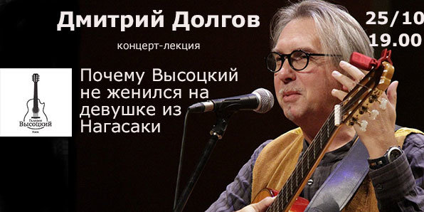 Дмитрий Долгов представит песенную программу "Первая любовь Высоцкого или почему он не женился на девушке из Нагасаки" по произведениям В. Высоцкого, А. Вертинского, Б. Окуджавы, А. Галича, М. Анчарова и др. мСтоимость: 100 грн