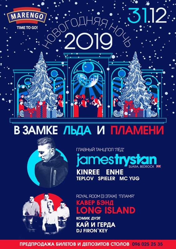 В новогоднюю ночь, на вашем любимом танцполе Royal Room (3 этаж), хедлайнерами ночи станут одни из самых крутых кавер групп столицы, ультрамодный бэнд LongIsland. Градус хорошего настроения будет ежеминутно повышать комик дуэт Кай и Герда, шутки которых не оставят равнодушными никого. За пультом в эту ночь правит бал главный повелитель нашего волшебного замка – Dj Firon'key. Он уж точно знает толк в праздничных танцах. До встречи в Новогоднюю Ночь!