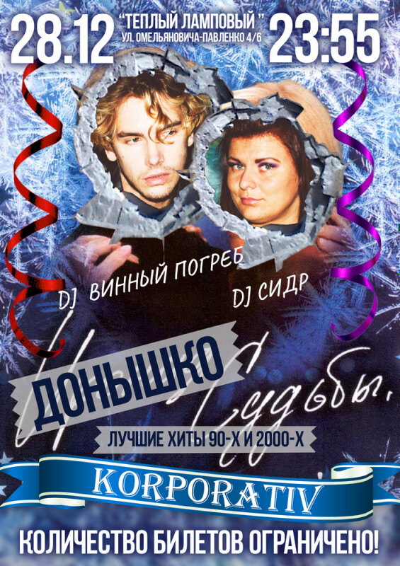 Совсем скоро, уже 28 декабря, в "Теплом Ламповом" (если кто-то не в курсе, клуб полгода как переехал и находится по адресу ул. Омельяновича-Павленка, 4/6!!!) — "Донышко судьбы": KORPORATYV! Мы помним, что у некоторых из вас 29 декабря — рабочий день, но копоратив — на то и корпоратив, чтобы на следующий день было больно и невыносимо стыдно. Приходи, пей, гуляй, танцуй, целуйся со знакомыми и незнакомыми людьми!