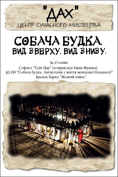 «Собача будка» - вистава-плач, в основу якої покладено виривки з різних творів, співзвучних історичним подіям, що відбувалися і відбуваються в Україні дотепер.