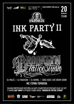 20 февраля приходи на вечеринку в клуб FRANKLIN и участвуй в розыгрыше бесплатного тату сеанса у самой LADY VAMP в лучшей студии Киева "BROOKLYN TATTOO STUDIO" остальные два победителя получат скидку в 50% на один тату сеанс.