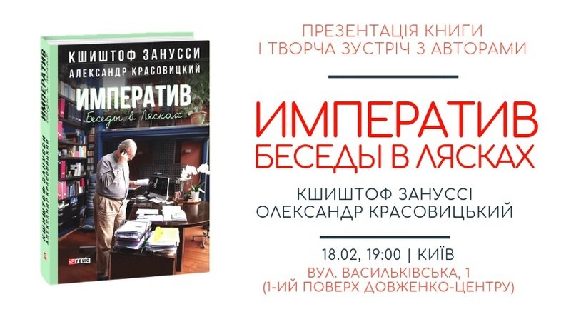 Приглашаем 18 февраля в 19:00 на презентацию книги Кшиштофа Занусси и Александра Красовицкого «Императив. Беседы в Ляско »и творческая встреча с авторами. Мероприятие состоится в магазине-кафе «Довженко книги.кава.кино» (ул. Васильковская, 1, 1 этаж Довженко-Центра).