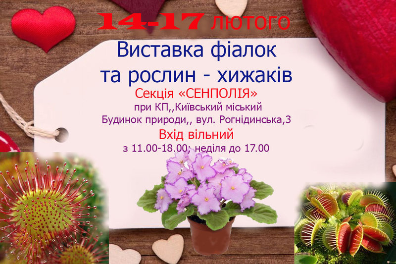 Выставка фиалок и растений-хищников 14-17 февраля Секция "Сенполия" при КП "Киевский городксой Дом природы" приглашает киевлян и гостей столицы на свою первую в этом году выставку африканских фиалок. Эта выставка проходит в день св.Валентина, поэтому для влюблённых пар, которые посетят эту выставку, мы приготовили подарки – листики фиалочек для самостоятельного выращивания в память об этом романтическом событии. Кроме африканских фиалок на выставке будут представлены разнообразные насекомоядные растения, так называемые растения-хищники: дианеи, непентесы, росянки и др. В природных условиях растения-хищники живут в воде пресноводных водоёмов, на заболоченных лугах и болотах, в торфе, песке. Эти растения имеют не только необычный вид, но они отличаются между собой разнообразными способами привлечения насекомых. Все растения подходят для выращивания в комнатных условиях. Ухаживать за ними не сложно: необходим солнечный свет, очищенная вода для полива, для некоторых растений – прохлада зимой. Вход на выставку свободный! Адрес проведения: КП “Киевский городской Дом природы”, ул.Рогнединская,3 (ст. М “Палац Спорту”) Времы роботы с 11-00 до 18-00, в воскресенье до 17-00.