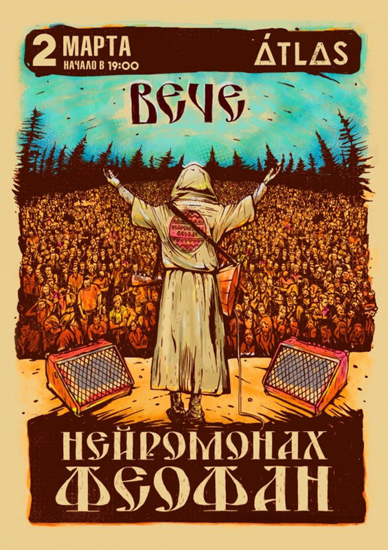 Никто не знает, как он выглядит на самом деле: на концертах солист проекта прячет лицо под капюшоном, из-под которого торчит только густая борода. На выступлениях Нейромонаха Феофана совершенно особенная, неповторимая атмосфера: сами гости часто облачаются в народные костюмы и участвуют в многочисленных активностях. Концерты Феофана — это шоу, происходящие не только на сцене, но и в зале, и «Вече» обещает стать новой главой в их истории.