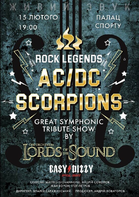 15 лютого о 19:00 в Палаці Спорту симфонічне триб’ют шоу Rock Legends від Lords of the Sound. Енергія легенд року SCORPIONS та AC/DC в одному концерті!