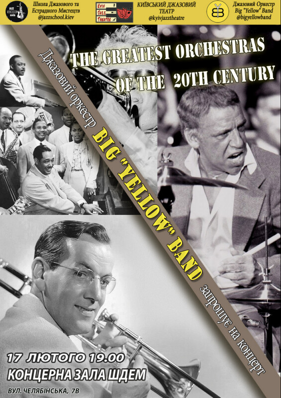 Джазовий оркестр Big “Yellow” Band запрошує зануритись у світ джазової музики і відвідати концертну програму присвячену найвідомішим біг-бендам ХХ-го століття – «The Greatests Orchestras of the 20th Century». Програма включає в себе найвідоміші композиції оркестрів Глена Міллера (Glenn Miller Orchestra), Бенні Гудмена (Benny Goodman Orchestra), Каунта Бейсі (Count Basie Orchestra) , Томмі Дорсі (Tommy Dorsey big-band), Дюка Еллінгтона (Duke Ellington Orchestra), Мейнарда Фергюсона (Maynard Ferguson and his Orchestra) та Бадді Річа (The Buddy Rich Big Band) . Для кожного слухача це унікальна можливість насолодитися потужним звучанням оркестру і поринути в атмосферу джазової музики 30-х – 80х років минулого століття.