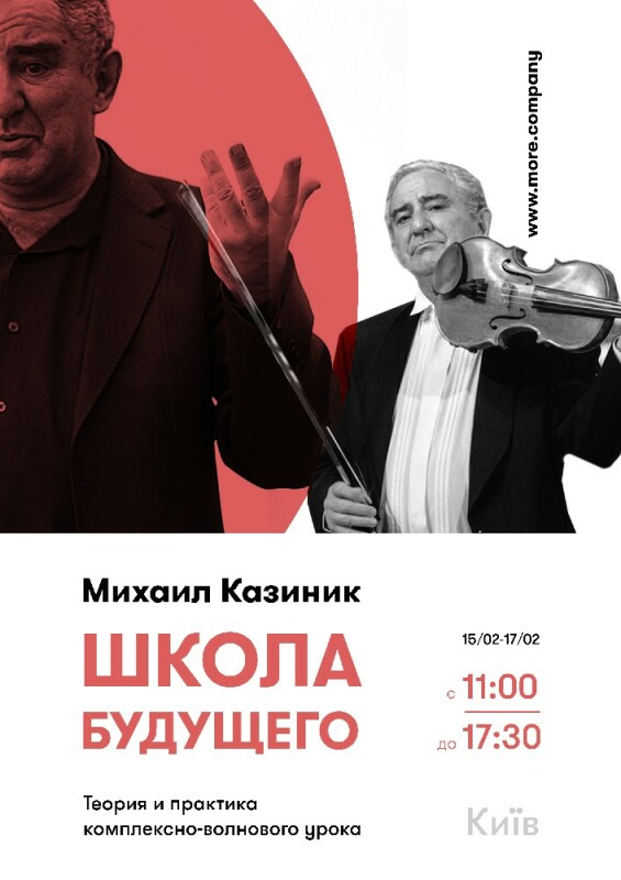 Впервые маэстро представит свою концепцию комплексно-волновых уроков в Киеве, и это будет так же мало похоже на обычный семинар, как Школа будущего на традиционную. Монолог Михаила Казиника перемежается музыкой: скрипке Бориса Казиника аккомпанирует фортепиано Вячеслава Зубкова.