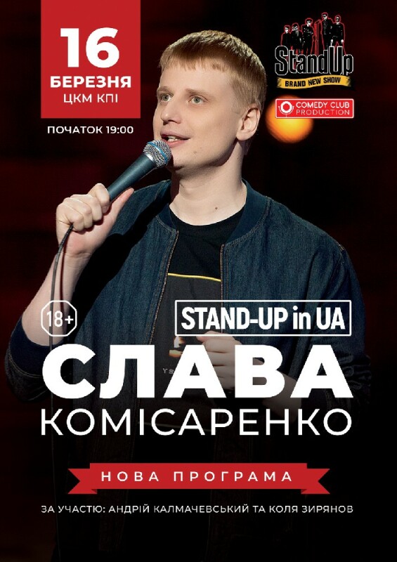 Слава Комісаренко, додатковий концерт у Києві! 16 березня о 19:00 в Палаці Культури КПІ топовий комік представить абсолютно нову програму. Запрошені гості: Андрій Калмачевський та Коля Зирянов.