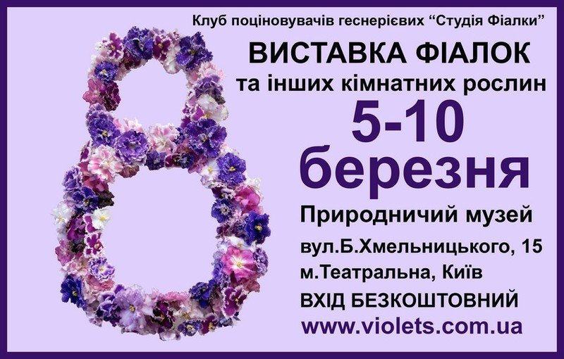 Святкова виставка фіалок Київський клуб колекціонерів геснерієвих Студія Фіалки: запрошує всіх киян та гостей столиці на виставку фіалок та інших квітів! У перші весняні дні пропонуємо поринути у атмосферу квітучого саду. Зіноманітність фарб і форм, яких так не вистачало напротязі двокольорової зими. Буде представлено біля 500 квітучих сортів фіалок. У виставці приймає участь український селекціонер фіалок Дмитро Денисенко. Сорти з приставкою Dn-. Також буде працювати консультаційний центр у якому відвідувачі зможуть дізнатись всі нюанси та хитрощі у вирощуванні, розмноженні, та лікуванні рослин родини геснерієві (фіалки, стрептокарпусі, глоксинії, ахісенеси, та инші) Місце проведення: Національный науково-природничий музей НАН України (Археологічний музей) м.Театральна Київ, вул. Б.Хмельницького 15 Виставка працює з 5 по 10 березня 10.00-18.00 (вхід до 17:30) неділя до 17.00 Вхід вільний