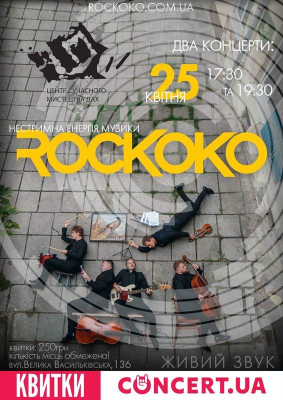 ЧОМУ ВАРТО ПІТИ НА КОНЦЕРТ ROCKOKO? 1. Симбіоз абсолютно різних жанрів. 2. Ні на що не схожі складні композиції. 3. Атмосферний камерний вечір. Поєднання прогресивного року і академічних підходів, структурно складні композиції, нетривіальні гармонії, велика кількість ритмічних переходів. ROCKOKO - львівська симфонічно-роковий гурт. У складі п'ятеро музикантів: скрипка, дві віолончелі, бас гітара і барабани. До заснування учасники грали академічну музику в оркестрі, тому багато взяли від класики. Перші експерименти полягали в власному аранжуванні відомих пісень. Так виникла композиція в якій об'єднані "We will rock you" і "They do not really care about us" Майкла Джексона. Серед всіх авторських композицій є одна, основна ідея якої зародилася після перегляду однойменного фільму "The Devil's Violinist". Автором оригінального твору "Erlkönig" є Франц Шуберт. Саме цитата з цього твору стала відправною точкою для авторського твору Михайла Романишина (скрипаль і композитор ROCKOKO). Виступи в ДАХ це камерне занурення в світ симфонічного року.