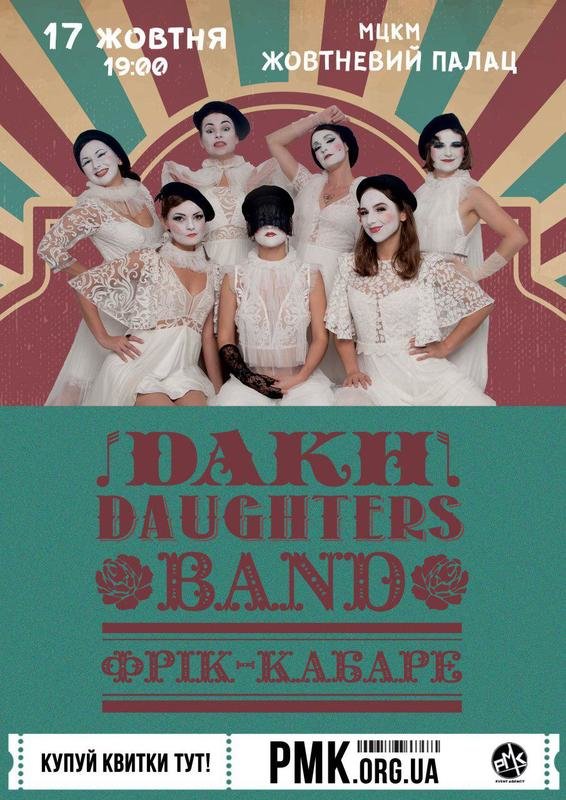 Dakh Daughters проект ЦСИ "ДАХ" и Влада Троицкого. Эта группа не имеет аналогов на украинской музыкальной сцене. Их творчество - это сочетание экстравагантных образов, классических инструментов и экспериментального звучания. Украинский фолк, французский рэп и регги-джемы, именно эти составляющие группа органично сочетает в своей музыке. Их песни отличаются нелинейными партиями. Сначала может показаться, что это просто какофония звуков, однако уже через мгновение вас подхватывает ритм и вы понимаете тонкий творческой замысел автора. Dakh Daughters – это интеллектуальная музыка для современных людей. Музыка, заставляет задумываться и делать выбор. Это манифест человека разумного."Украинский септет, что якобы сошел с рисунков Эдварда Гори или фильмов братьев Квей", – Rolling Stone.