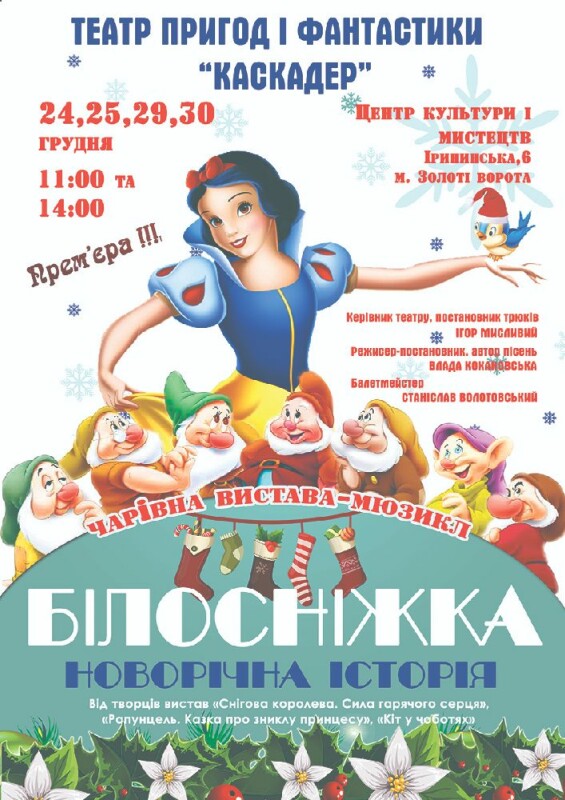 А потім на усіх чекає надзвичайний подарунок - прем’єра нового мюзиклу театру «Білосніжка. Новорічна історія» за мотивами твору братів Грим, герої якого запросять вас до справжньої казкової подорожі, повної пригод та святкових чудес.