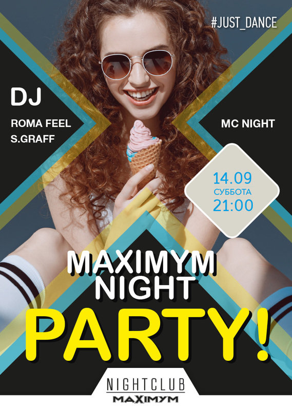 Ураганный концентрат самой отборной клубной музыки в одном большом танцевальном флаконе! Коктейль драйва и звука! Только для тебя и только в Максимуме! Всю ночь развлекают DJ ROMA FEEL и DJ S.GRAFF,а так же MC NIGHTОчаровывают всю ночь STAR GIRL SHOW.