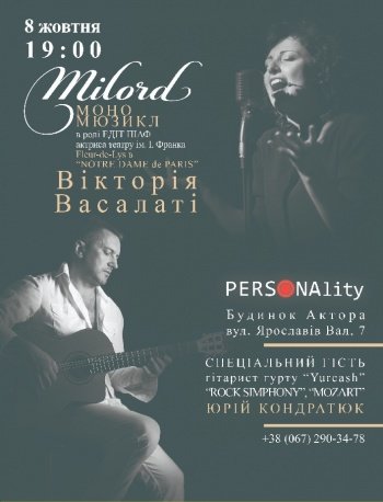 Виктория Васалати - актриса, композитор, певица, которую называют украинской Эдит Пиаф, известная многим, как исполнительница главной роли в мюзикле театра Ивана Франко «Эдит Пиаф. Жизнь в кредит », постоянная участница легендарного мюзикла« Notre Dame de Paris», финалистка «Голоса Страны», обещает подарить настоящую атмосферу Парижа.