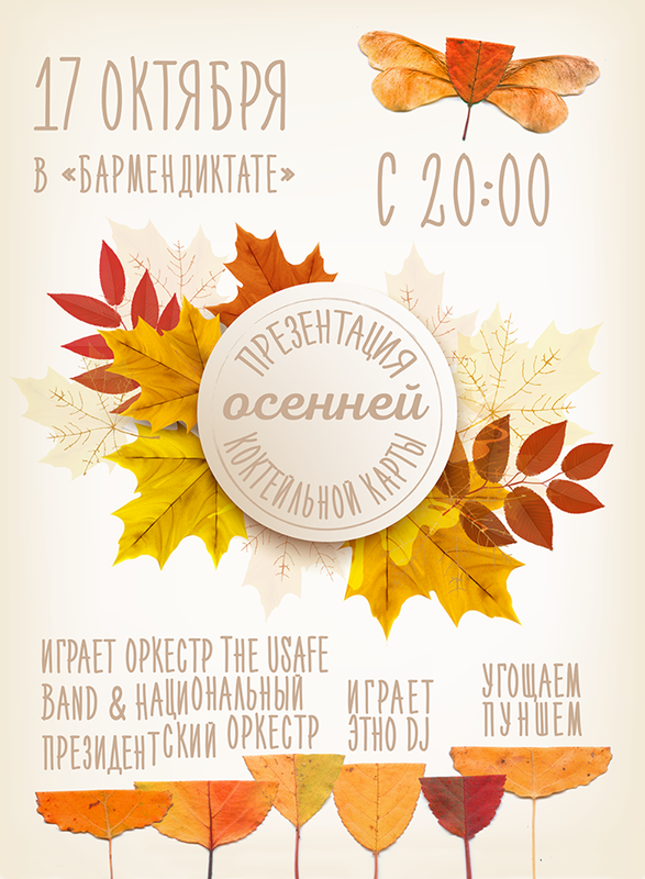 Первый день продаж сезонного коктейльного меню "Украинская осень" мы отметим с помпой. Будут литься пунш и разлетаться закуски (gratis, то есть бесплатно). Будет играть оркестр, состоящий из музыкантов The USAFE Band (оркестр ВВС США в Европе) и Национального президентского оркестр. Потом их сменит диджей. А! И будет же еще пять коктейлей из меню "Украинская осень"!