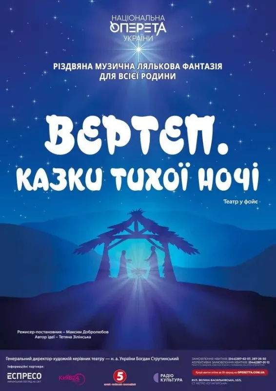 На Малій сцені в правому фойє Київського театру оперети відбудеться Різдвяна лялькова казка для всієї родини за мотивами традиційного українського вертепу та ігор. Ви дізнаєтесь про давні традиції святкування Різдва, які започаткували ще наші пращури століття тому.