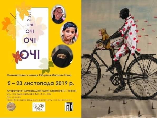 Выставочный проект "ГЛАЗА" / Exhibition "EYES" По случаю 150-летия Махатмы Ганди Центр Тагора при Восточно институте развития в партнерстве с Литературно-мемориальным музеем-квартирой П. Г. Тычины в г.. Киеве презентуют выставочный проект «ГЛАЗА». Выставка представляет фотоматериалы из Индии - это фотографии обычных людей. Поражает выражение их лица, особенно глаза. Радость, отсутствие агрессии. Фото сделаны в разные периоды, народным художником Украины Юрием Камышным и буддистом Владимиром колеблет во время их путешествий Индией. Их глаза видели именно такой родину Махатмы. Вспомним слова Павла Тычины: «... университет, музеи и библиотеки не дадут того, что могут дать карие, серые, голубые ...». А что увидите Вы в этих глазах? В двух картинах индийского художника Ґурмита Марвы изображено то, как он видит Ганди в своем воображении: Ганди, который движется против направления танков вооруженного мира - то велосипедом, то с корзиной, наполненной любовью. А что увидите Вы? В рамках проекта будут интересны лекции и мероприятия, откроют для вас мир Индии. Следите за анонсами. Открытие выставки состоится 5 ноября в 18:30. Локация: Музей-квартира П.Г.Тычины ДАТА и ВРЕМЯ: 05.11.2019 - 23.11.2019 г. Стоимость: 15 грн. Детали по телефону 234-43-27 или писать [email protected]