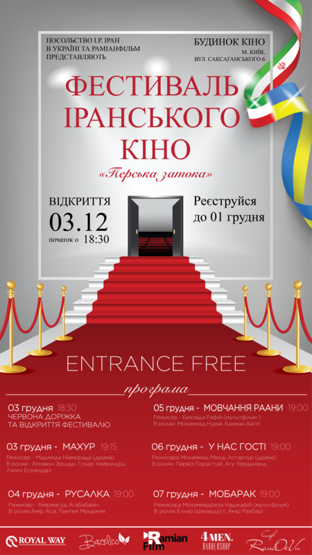 Первый Фестиваль Иранского кино в Украине, который организован при поддержке Посольства Исламской Республики Иран и кинокомпании РАМИАНФИЛЬМ. Окунитесь в атмосферу восточного кинематографа.