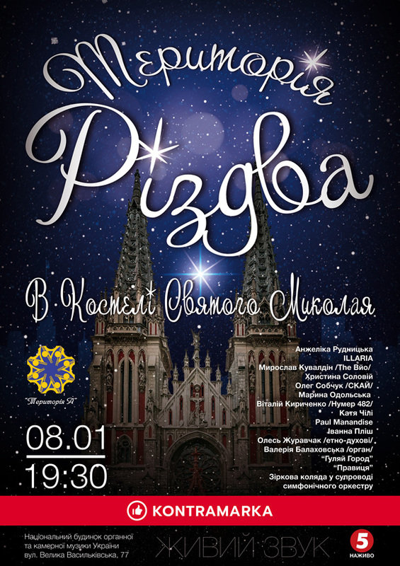 Звёздная коляда в сопровождении симфонического оркестра «Территория Рождества». Анжелика Рудницкая, ILLARIA, Мирослав Кувалдин /The Вйо/, Христина Соловий, Марина Одольская, Олег Собчук /СКАЙ/, Катя Чили, Виталий Кириченко /Нумер482/, Paul Manandise, "Гуляй Город", "Десница" и другие с родными колядки в сопровождении симфонического оркестра и только вместе с Вами! Только представьте, как торжественно и возвышенно звучат хорошо знакомые Рождественские мелодии и хоралы в стенах готического костела начала ХХ века. Этот незабываемый вечер музыки подарит вам настоящий Рождественское настроение и наполнит сердце чувством покоя и благодати. А звучание симфонических инструментов подчеркнет аристократичность этого концерта.