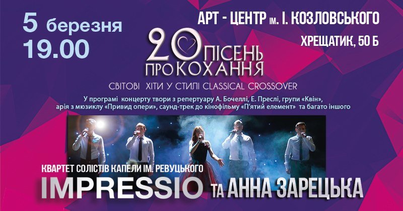 Квартет "Impressio" и Анна Зарецкая приглашают на концерт к Международному женскому дню "20 песен о любви. Обновлённая программа".