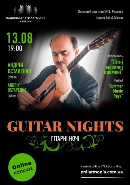 Один из ярких представителей гитарной исполнительской школы Украины, заслуженный артист Украины Андрей Остапенко выступит сольно в концерте под названием «Guitar Nights». В его исполнении прозвучат популярные произведения композиторов-классиков, были также и легендарными исполнителями. Подарите себе приятный вечер с музыкой для гитары!