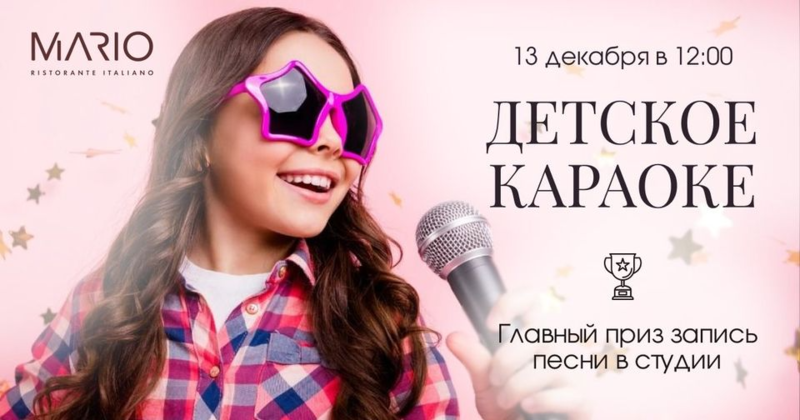 Уже в воскресенье 13 декабря приглашаем всех наших маленьких гостей и их родителей посетить караоке MARIO! Специально для деток мы устроим волшебный праздник с ведущей-аниматором, а их родители смогут приятно провести время наслаждаясь блюдами и напитками нашего ресторана! Главный приз – запись песни в профессиональной звукозаписывающей студии