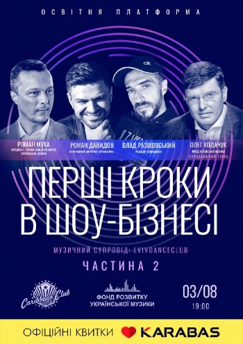 Фонд Развития Украинской Музыки и Caribbean Club Concert-Hall приглашают гостей на вторую лекцию в рамках образовательной платформы «Первые шаги в шоу-бизнесе». Это событие создана для тех, кто уже начал свою музыкальную карьеру или планирует начать в ближайшее время. У слушателей будет возможность задать вопросы спикерам и получить персональный ответ. Также, гости вечера смогут познакомиться с интересными людьми из мира шоу-бизнеса, которые являются экспертами в своих областях.