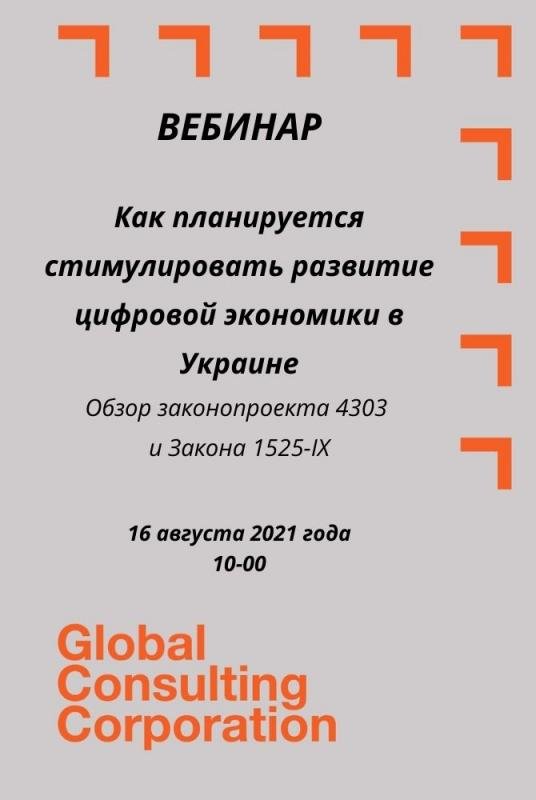 Корпорация «Глобал Консалтинг» приглашает принять участие в вебинаре «Обзор законопроекта 4303 и Закона 1525-IХ. Как планируется стимулировать развитие цифровой экономики в Украине».