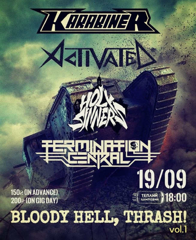 ACTIVATED (Thrash Metal)https://www.facebook.com/Activatedofficial HOLY SINNERS (Thrash Metal) https://www.instagram.com/holysinnersofficial/ TERMINATION CENTRAL (Death Metal) https://www.facebook.com/TerminationCentral KARABINER (Thrash Metal)https://www.facebook.com/karabinerthrash
