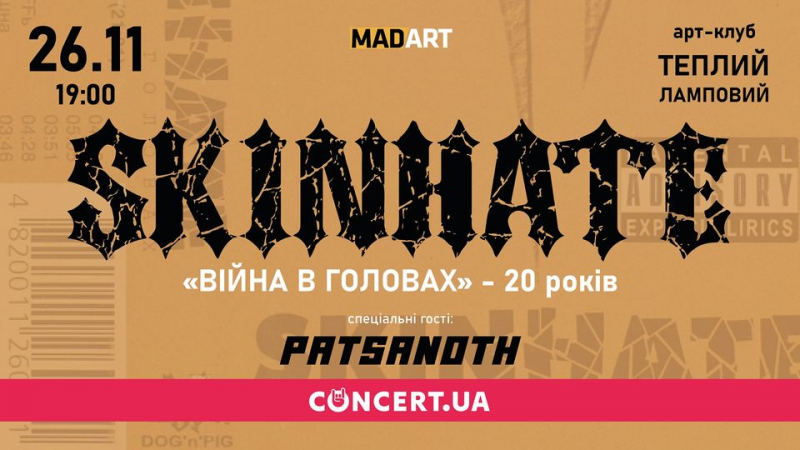 Легенды украинского хардкора - группа SKINHATE возвращаются в столицу с большим сольным концертом.20 лет назад вышел первый альбом группы - "Война в головах", который стал мощным началом большой истории SKINHATE. Каждый, кто знает эту группу, сразу узнает обложку диска и трек-лист, годами вдохновлял фанов.Ребята готовят крутую шоу-программу, в которую войдут первые хиты, легендарные композиции и новые треки.Группа SKINHATE начал свою деятельность в 1999 году и по сей день продолжают удивлять и заряжать энергией свою аудиторию. Более 20ти лет на тяжелой сцене нашей страны они доказывают, что трушних хардкор - это сила. Группа выступала на крупнейших и самых известных украинских фестивалях, отъездил не один тур по городам Украины и имеет на своем счету 4 культовых альбомов.Приглашаем вас окунуться в дикий слэм и спеть все хиты вместе с нами.26 ноября во клубе Теплый Ламповый.Специальные гости шоу - группа PATSANOTH, который после долгой паузы возвращается с новыми силами, старыми хитами и свежими треками, чтобы по традиции расшевелить каждого из вас, вместе со SKINHATE.