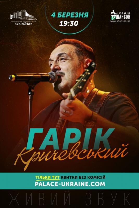 Известный украинский шансонье представит публике лучшие любимые песни, по которым так соскучились! Гарик Кричевский, заслуженный артист Украины, многократный обладатель премии «Шансон», знаменитый автор и исполнитель, признанный лучшим шансонье в Украине! Гастрольный график артиста расписан на много месяцев вперед и с разной географией разных уголков нашей страны и зарубежья!