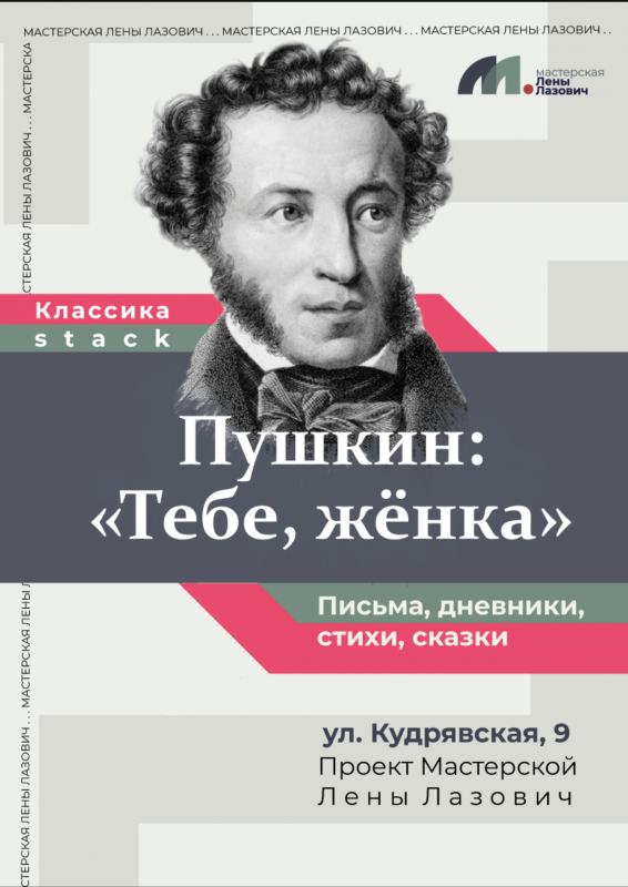 Театральная Мастерская Лены Лазович совместно с Киевским музеем А.С.Пушкина, в рамках проекта "Классика-stack” приглашает Вас на спектакль-калейдоскоп «Пушкин: «Тебе, жёнка» (сказки, отрывки из «Евгения Онегина», стихи, письма и воспоминания современников).