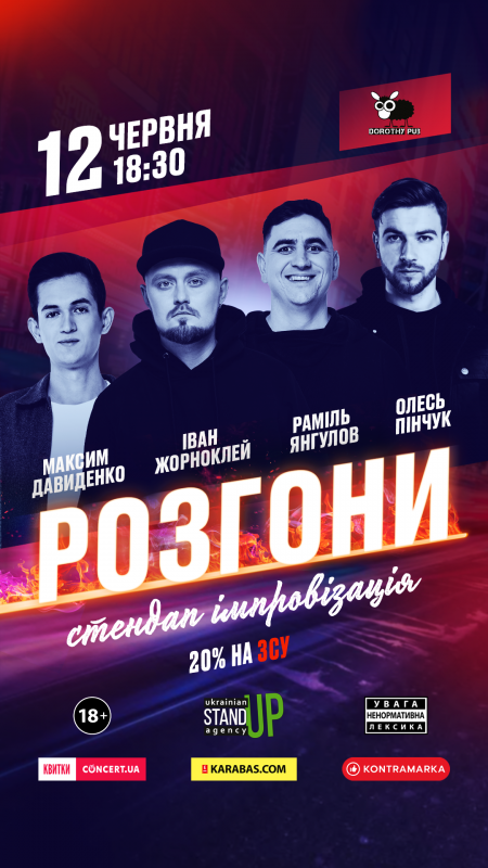 «Стендап Розгони» - це імпровізаційне стендап-шоу, в якому коміки допомагають, чи то правильніше сказати "розганяють" смішнючий матеріал безпосередньо перед глядачами.
