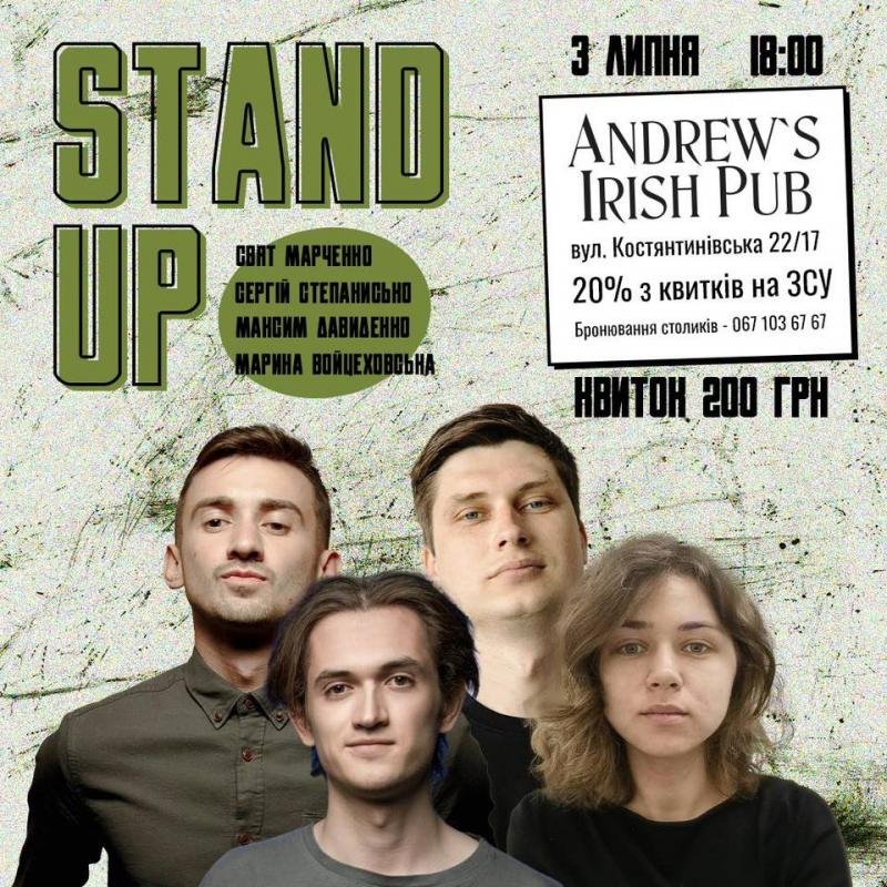 У неділю 3.07 топові і максимально проукраїнські коміки внесуть посмішок у це неспокійне літо. Люта четвірка роздасть актуальної комедії, зарядить на цілий тиждень життям, свободою думки та зневагою до "північно-східних боліт" на сцені Andrew's Irish Pub на Подолі.
