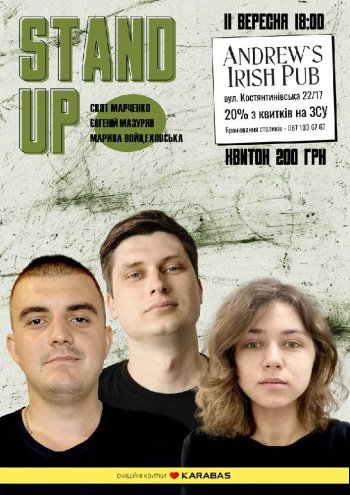 У неділю 11.09 максимально проукраїнські коміки внесуть посмішок у цей неспокійний час. Люта трійка роздасть актуальної комедії, зарядить на цілий тиждень життям, свободою думки та зневагою до "північно-східних боліт" на сцені Andrew's Irish Pub на Подолі.